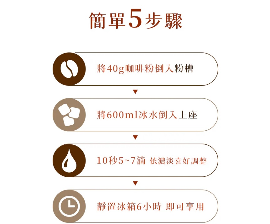 .建議可用冷水萃取,亦可將設計款冰滴放置冰箱內,以維持穩定的萃取環境。